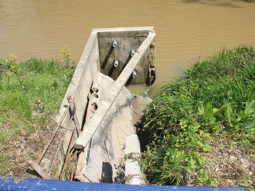 Pour ce chantier, situé en zone rurale, notre client nous a sollicités pour la reconstruction d’une écluse essentielle reliant deux étangs. La structure initiale, affaiblie par l’érosion au fil des années, avait fini par s’effondrer, rendant l’intervention urgente.